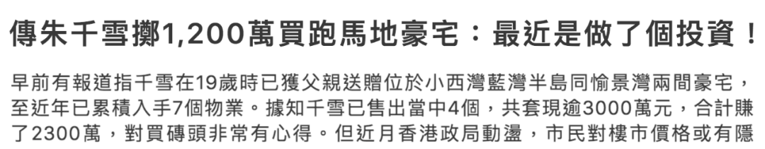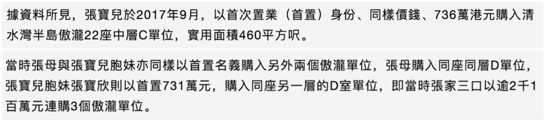 港媒报道他家除了在跑马地礼顿山拥有三个物业外,还大手笔在西贡傲泷一举扫入四个单位,光物业总价就超过了3个亿。