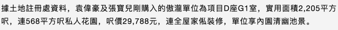 ▲ 购入的是200多平米的四居室复式,还额外花了400万买下两个车位。张宝儿把早前持有的物业转让给了母亲,跟袁伟豪同样以首次置业身份购入,省下了近700万的印花税。