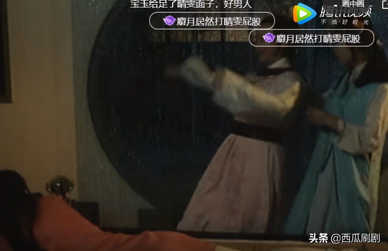 这里与原著相同的情节就不赘述了,撕完扇子,麝月与晴雯打着玩耍。可能要体现二人的亲近吧。