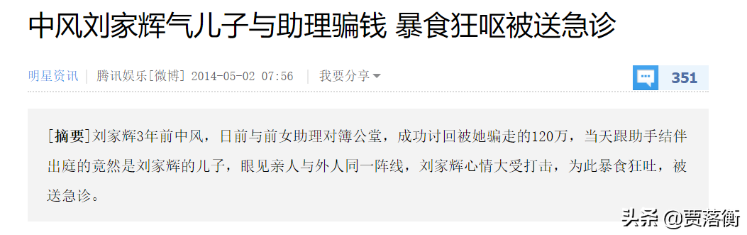 不过这不是最让刘家辉伤心的,直接击败刘家辉内心防线的是刘家辉的两任妻子都不曾来医院探望过他。甚至有传闻说他的第二任妻子马飞凤觊觎他的百万财产
