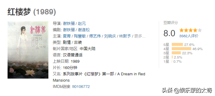 1989年电影版《红楼梦》豆瓣评分一直维持在8.0,是个相当不错的成绩,它投资巨大,大观园和宁国府都是实景建造,原著中的许多名场面如黛玉葬花、晴雯补裘、怡红夜宴等,也都在浓缩后集中体现了出来,更难能可贵的是,电影版的结尾,是按照续作改编的,比较忠于原著,这一点是有别于电视剧版的。