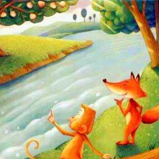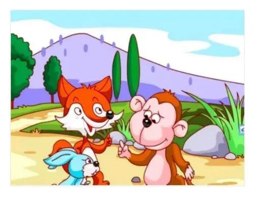 狐狸带着小猴来到山坡下,山坡下有颗桃树,桃树长满了红彤彤的桃子,小猴来到桃树下,用手比了比,兴奋的大叫“这真是比我的桃子还大,狐狸先生你没有骗我”狐狸见小猴上当了,赶忙说“不仅大还很甜呢,不过,如果你想尝尝的话是不可以的哦,我一般都不会轻易送给别人”