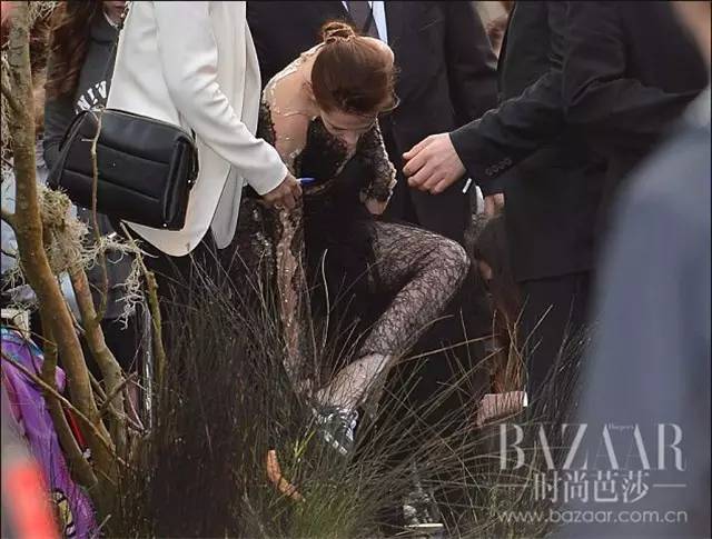 克里斯汀真是将脱鞋贯彻到底,《白雪公主与猎人》的红毯设在草坪上也不怕,用平底鞋来帮忙。