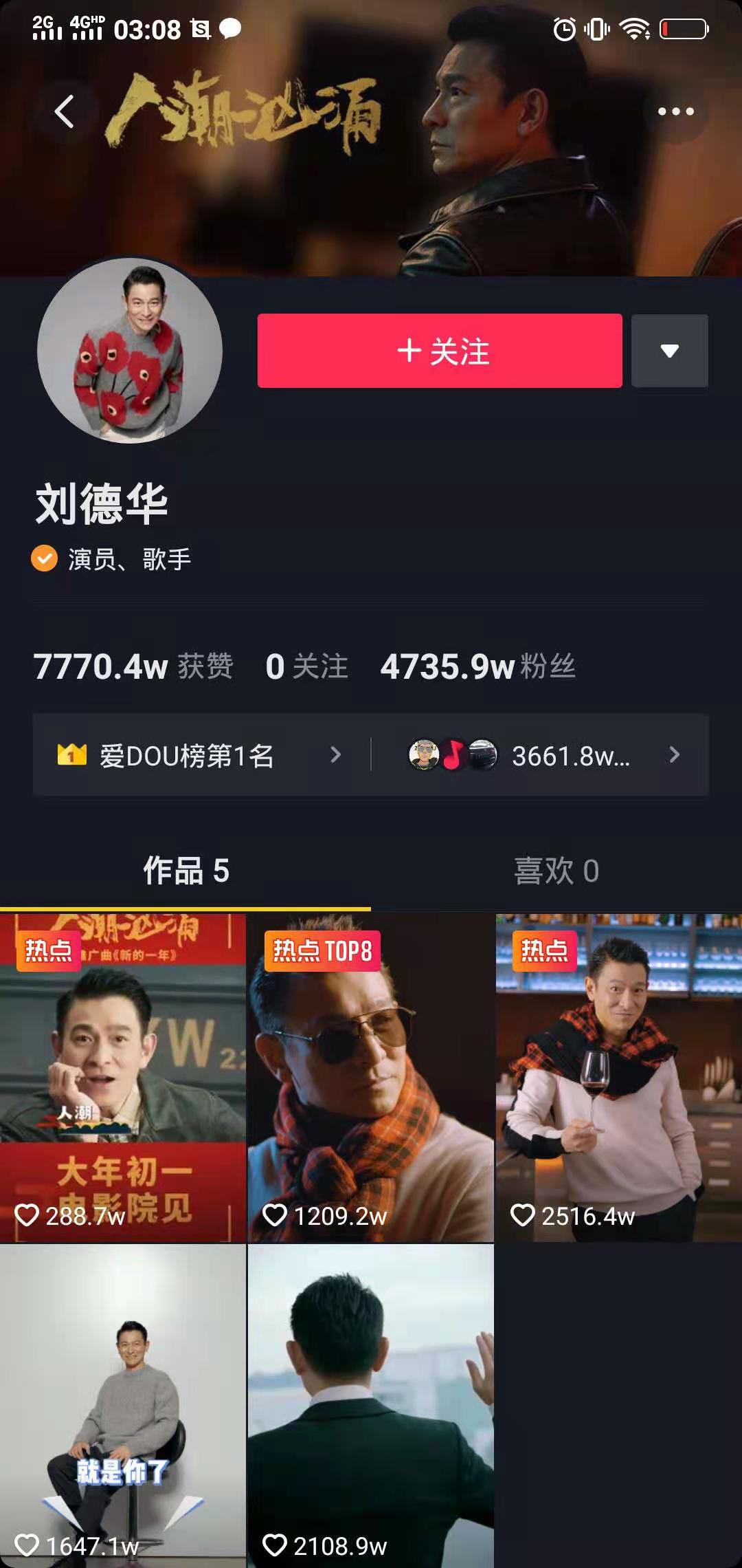 这几天刷抖音的伙伴都应该刷到了华仔的视频;1月27日,抖音宣布天王刘德华入驻抖音,短短四天时间里,华仔的抖音账号涨粉4500多万,一举成为了爱dou榜第一名的明星。作为一个80后,一个华仔的忠实粉丝,很少玩抖音的我也重新安装了抖音并第一时间关注和点赞了,看到偶像如此高的人气,卓实为华仔感到开心和骄傲。