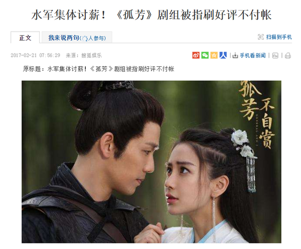 事后,《孤芳不自赏》深陷争议。除了因演员使用替身、抠图等不利消息外,还被水军指责剧组雇其刷好评不给钱、集体在该剧的官博底下讨薪。