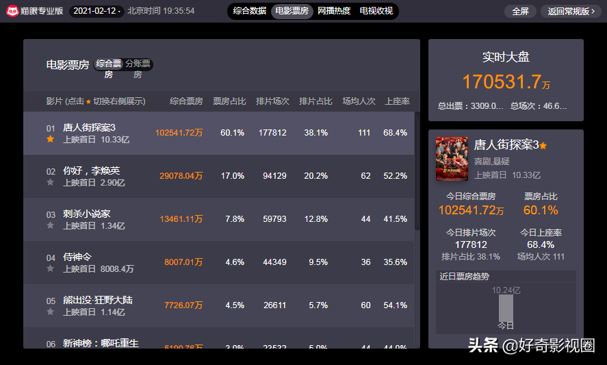 相比往年的春节档大片云集、明星荟萃的的电影市场,今年的电影市场少了一些竞争,一共七部电影,两部动画片《熊出没:狂野大陆》和《封神榜:哪吒重生》;两部奇幻类的《刺杀小说家》《侍神令》;而过年最火的喜剧类的有三部,除了《唐探3》,贾玲和沈腾带来的《你好,李焕英》也带来了不俗的表现,票房已经超过3亿,刘德华和肖央合作的《人潮汹涌》表现一般。因为去年的特殊情况,估计电影市场对今年的春节档也有了一些担心,而《唐探3》同期制作的电影也都已经上映,今年成就了《唐探3》一家独大的情况,让现在电影市场少了很多喜剧气氛。