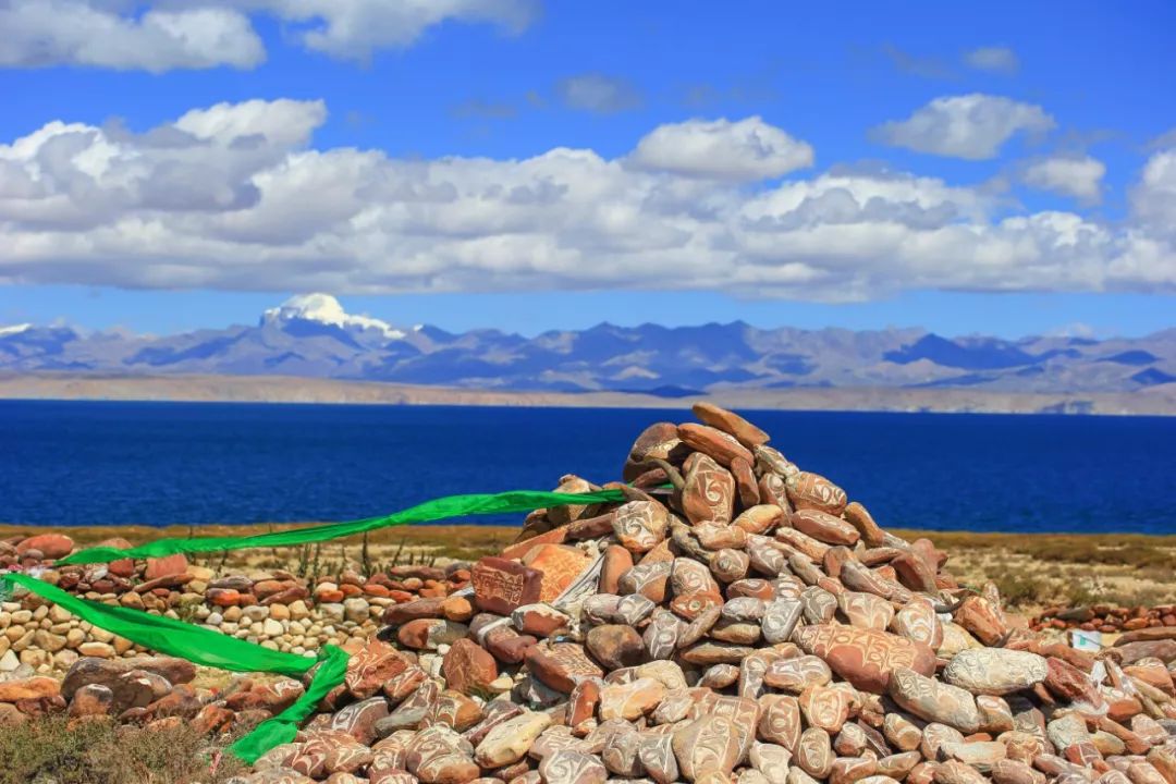 ▲ “圣湖”玛旁雍错的玛尼石堆,上面刻着佛教的六字真言。 图/卡布 《发现西藏》