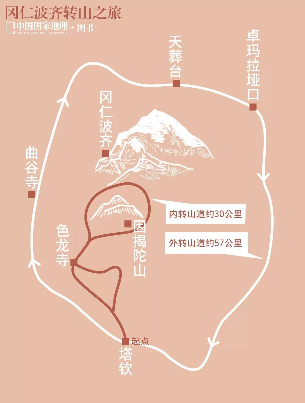 ▲ 转山之路大致分为外圈和内圈两种路线。外圈以冈仁波齐为中心,从塔钦出发,途经曲古寺,抵达哲日普寺,之后登上卓玛拉山口(海拔5630米),最后返回塔钦。内圈线路则以因揭陀山为中心。据传,转山路线是13世纪时由噶举派大师古仓巴开辟的。制图/paprika
