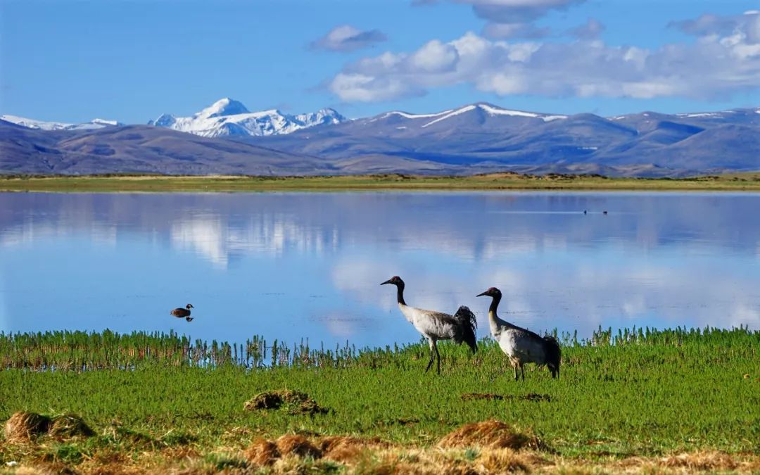 ▲ 玛旁雍错湖畔的黑颈鹤。图/蒲新志 《发现西藏》
