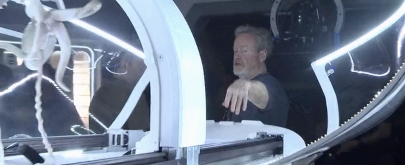 霍洛威走上祭坛,看到了一个类似绿色水晶一样的大型安瓿瓶,在早期拍摄的版本中,这里放置的是一个工程师的碗,和片头的碗很相似,后面之所以会换成绿色水晶,我认为还是和老雷的表达方式有关系,刻意放得更加隐晦一点,把答案留给观众去猜想。