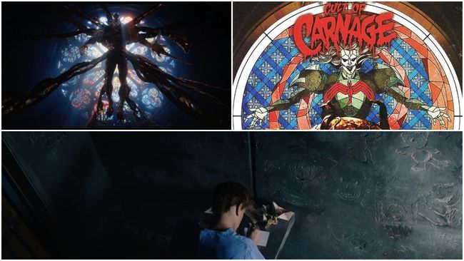 knull和cult of carnage: 屠杀的细胞上遍布着符号,而预告片结尾的那幅非常宗教化的carnage画面是对漫画《cult of knull》和《cult of carnage》的致敬。彩色玻璃照片也让人想起《毒液之网:屠杀邪教》的封面。此外,漫画中knull和ravencroft之间也有联系。