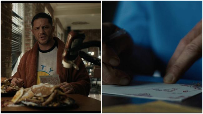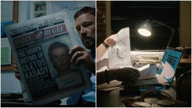 在监狱里,屠杀(cletus)一边写明信片一边压扁一只蜘蛛,这显然是在向《蜘蛛侠》致敬。之后我们看到埃迪在早餐场景中拿着一张类似的明信片,很可能是屠杀寄来的,后者现在被关在死囚牢房。屠杀和埃迪建立了关系,埃迪正在帮助警方找到一些屠杀的受害者。