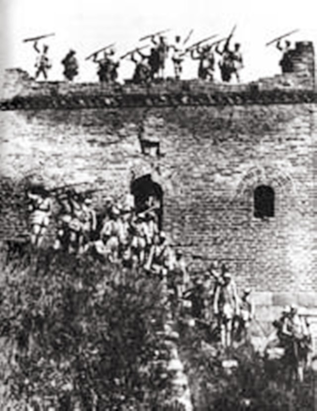 就在危机关头,爆破组当机立断对敌方投掷手榴弹,将敌方的机枪炸哑了,迅速冲上去依托庙门前的影壁为掩护,向庙中投掷手榴弹。