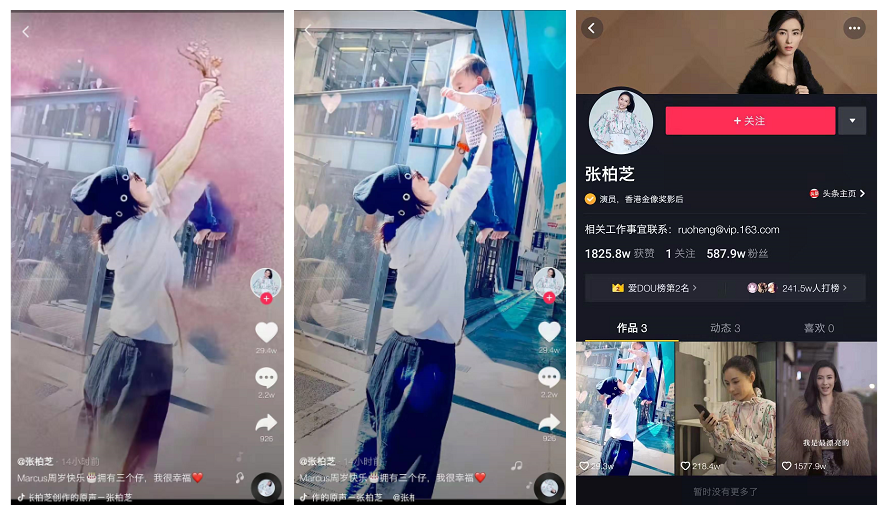 其实张柏芝也是玩抖音的,她在抖音上一共三条短视频,最新的一个就是他和儿子marcus的合照。