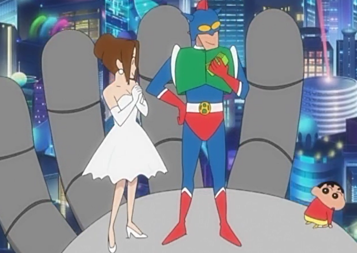作为本片的主角当然不能少了野原新之助,那个爱说荤段子、满嘴跑火车、喜欢漂亮大姐姐的五岁小孩,在本片里也是首次看见了小新未来的新娘。
