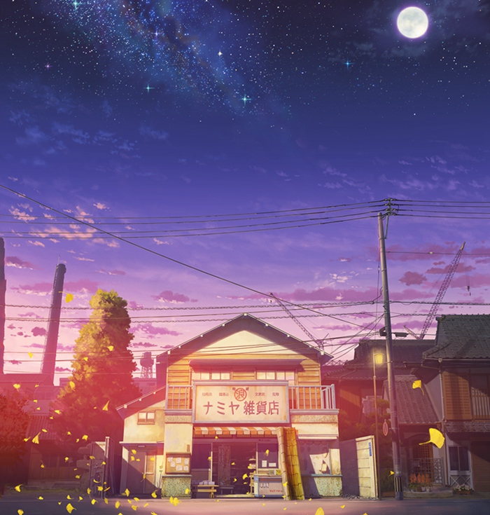 小说《解忧杂货店》于2011年在《小说野性时代》连载,2012年3月发行单行本。东野圭吾将故事设定在一间废弃的杂货店。躲在店内的三个无业青年无意间发现了店后的牛奶箱可以连通过去,在收到一封封求助信后,他们扮演起了三十多年前杂货店浪矢爷爷的角色,提笔和迷茫烦恼的求助者对话。来去间,这些信不仅对来自过去的求助者产生了影响,也改变了三个青年的人生。