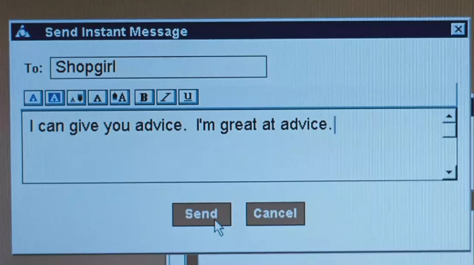 还有汤姆在最后很狡猾地在网上和现实中一块儿忽悠梅格,这些段落绝不会让你捧腹大笑,但是可以让你抿着嘴自我小陶醉一番...