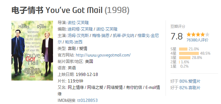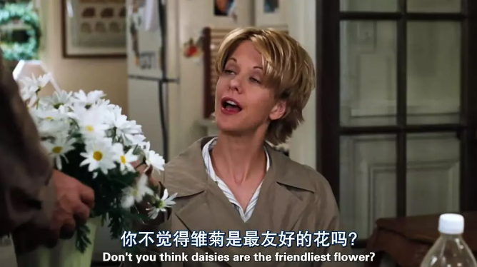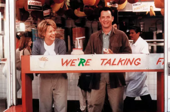依旧是汤姆·汉克斯和梅格·瑞安这对黄金搭档,依旧是神交已久的两人直到最后一刻才真正走到一起,依旧那么温馨而平实,依旧是教科书般纯正风趣的英语对白。