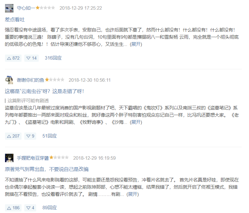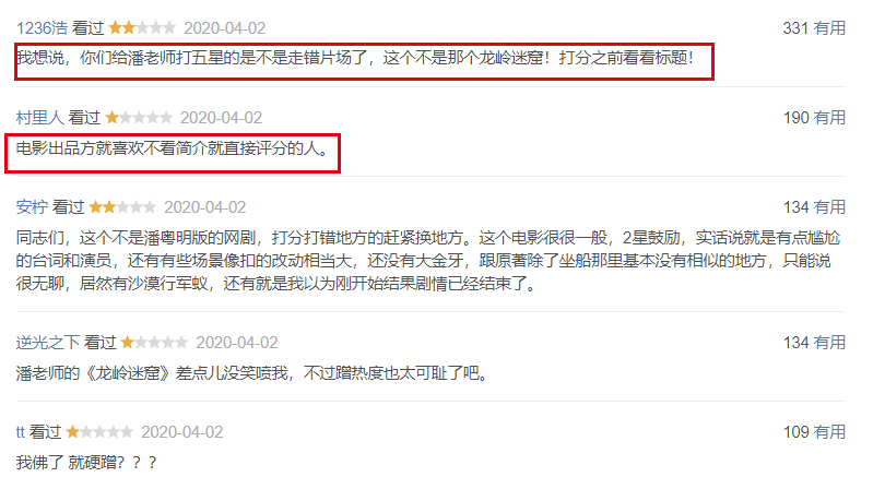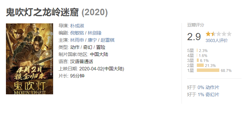 实在是不好意思,《鬼吹灯》系列的最低分直接就给了4月2日才刚刚上映的《龙岭迷窟》。只不过,这部《龙岭迷窟》不是潘粤明演的剧版《龙岭迷窟》,而是网大版。
