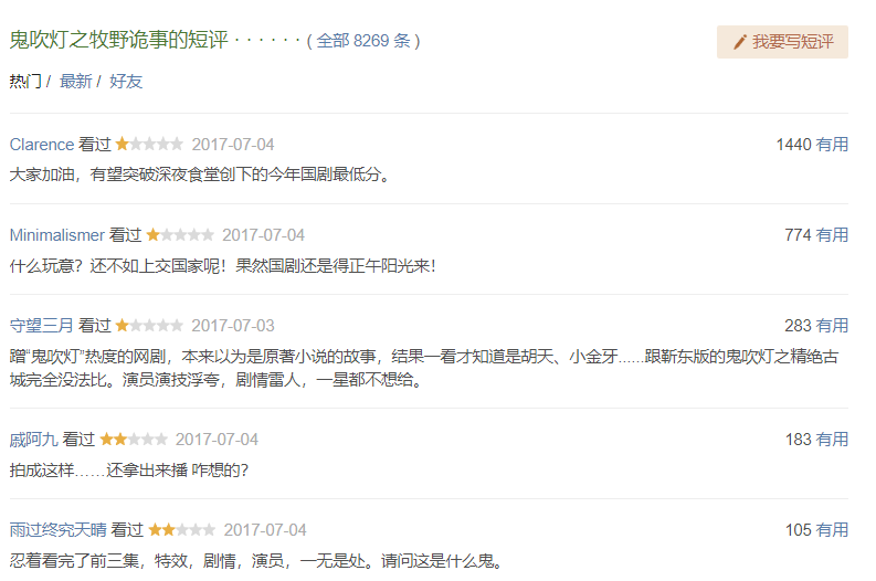 这部网大的热度蹭得相当及时,口碑崩得也是水银泻地。在豆瓣开播3.6,随后3.4、3.3、3.0,直到现在2.9.为啥下滑还那么快?原来很多豆瓣用户以为是潘粤明版,直接给了5颗星。
