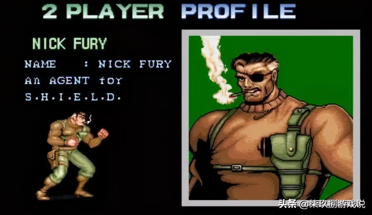 不知道有多少玩家注意到了,游戏中1p的角色名称为“punisher”,而2p则是“nick fury”。是的,这位叼着烟,带着眼罩,名为“尼克·弗瑞”的家伙,正是我们所熟知的神盾局的局长。