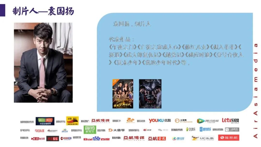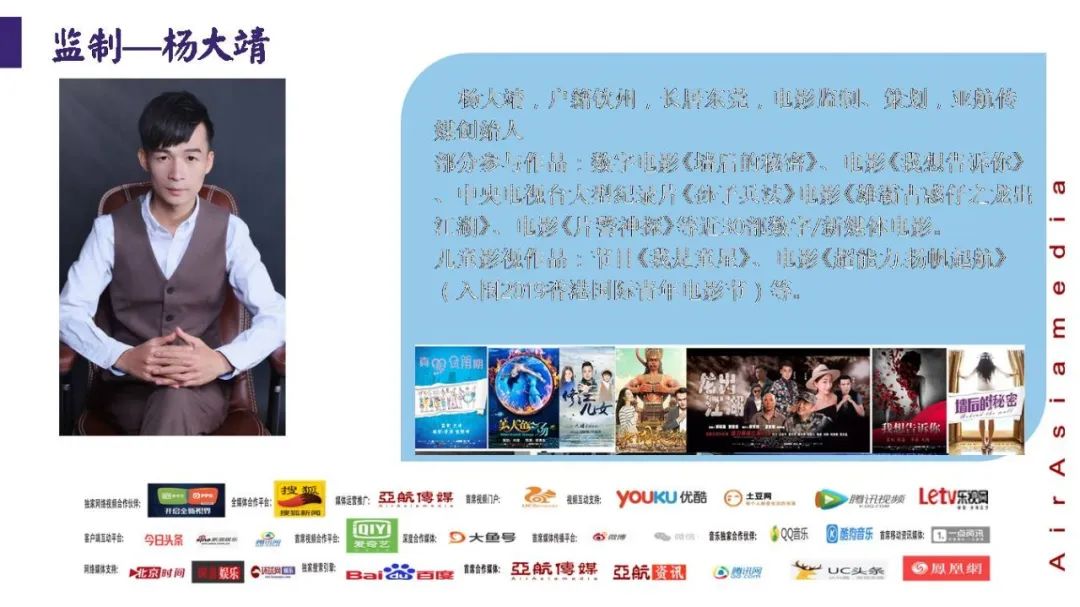 电影《大闹天竺村》策划、电影《雄霸古惑仔之龙出江湖》策划、电影《龙出江湖》策划、电影《我的少年时代》出品、电影《越莞记》出品摄制、电影《备胎逆袭战》策划、电影《备胎逆袭战2》出品摄制、数字电影《墙后的秘密》监制、中央电视台大型纪录片《孙子兵法》央视纪录片/执行、网络电影《穿越世纪的前任》监制/摄制、数字电影《真爱试用期》监制/制作/总制片、网络电影《美人鱼汤》总策划、网络电影《命运赌神》总策划、数字电影《真爱试用期》监制、数字电影《片警神探》监制、网络电影《修江儿女》出品摄制发行、电影《壹号合伙人》监制/总策划、院线电影《面具下阴谋》策划统筹/媒体运营、电视剧《历史名人传》出品/摄制、等。