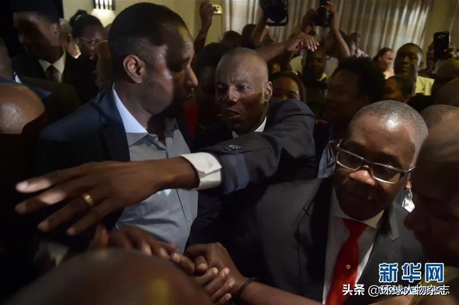 ·2017年1月3日,在海地首都太子港,选举法院宣布大选结果有效后,莫伊兹(中)接受祝贺。图片来源:新华网。