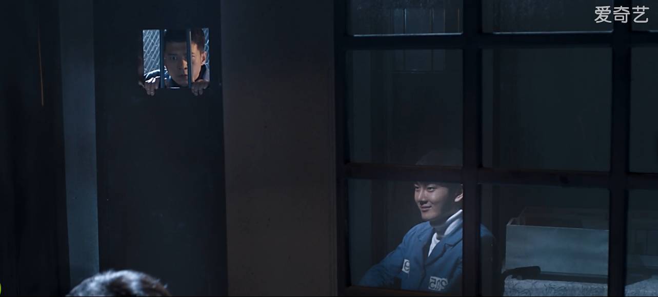 男主角入狱后站在人堆里,一半脸光明,一半脸阴影,暗示他即将失控、黑化的人物心理变化。