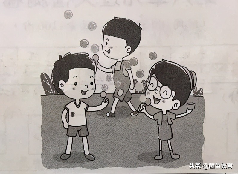 今天是星期六,小明、小青和茵苗一起到公园里玩。到了公园的草地上,茵苗拿出了一瓶肥皂水和三根带圆圈的小棒,说:“我们来吹泡泡吧!”大家用小棒蘸了一下肥皂水,对着圆圈轻轻一吹,圆圆的泡泡就飞出来了,在阳光下闪着五彩光芒!大家看了都高兴地哈哈大笑起来!