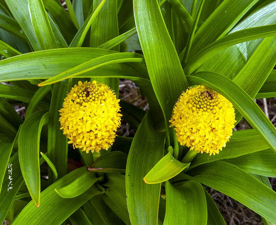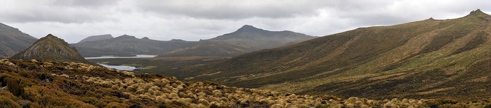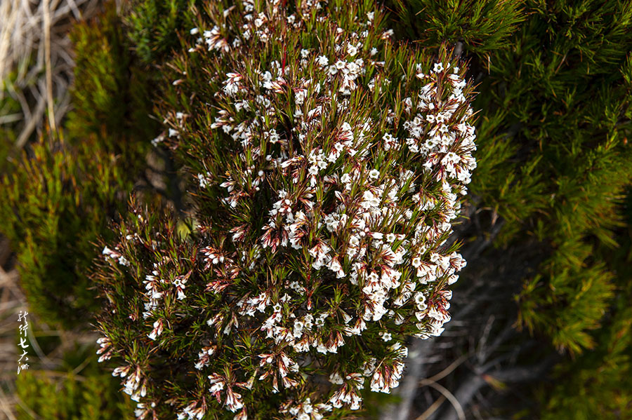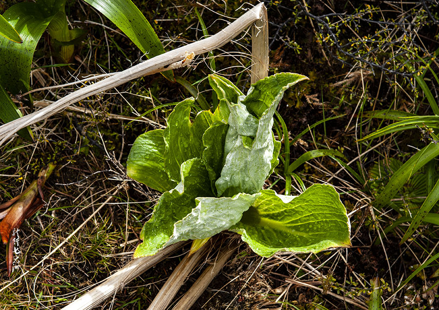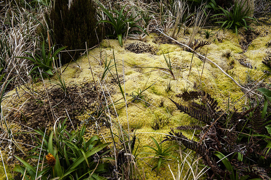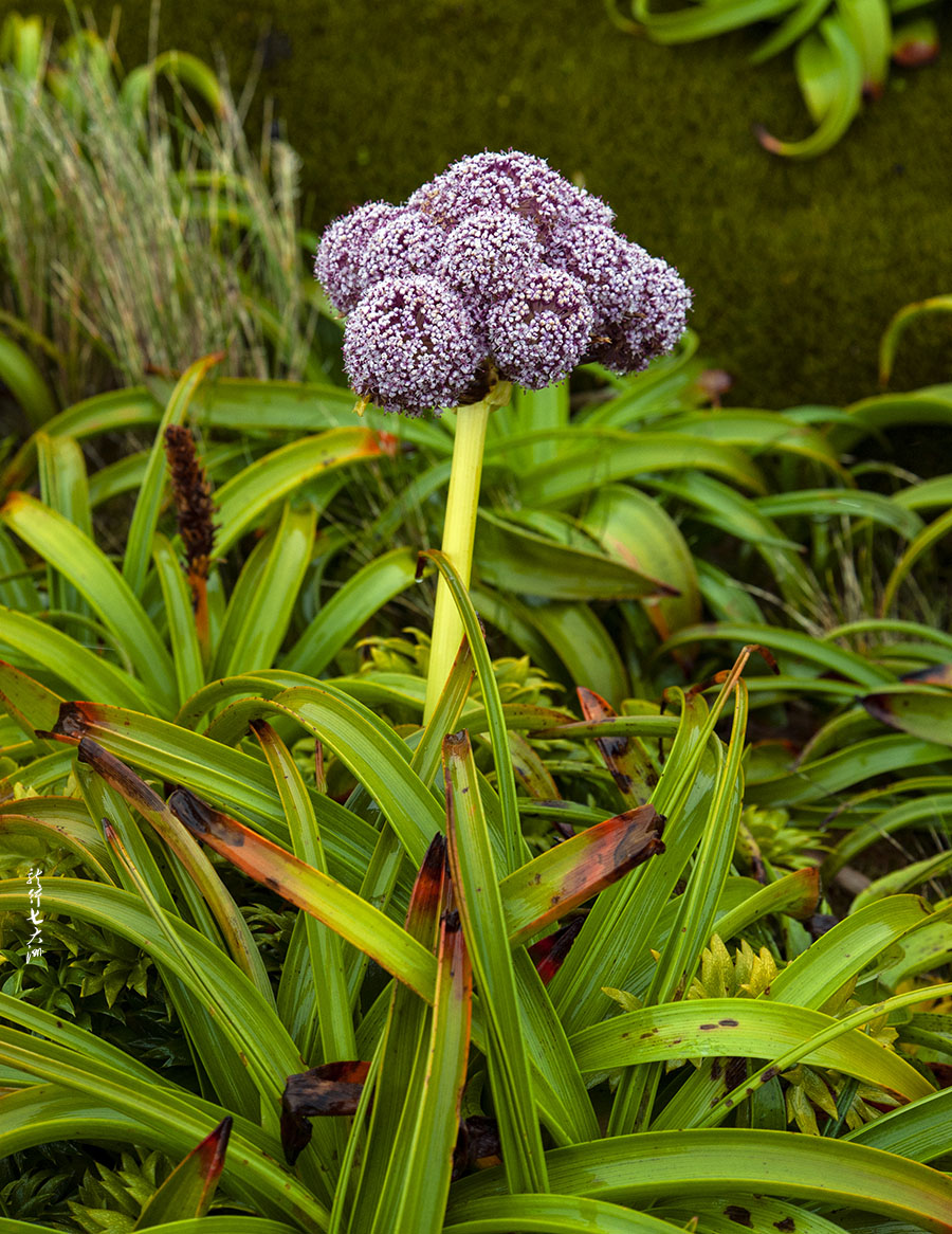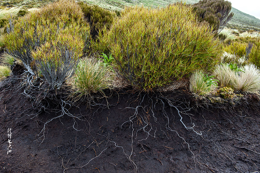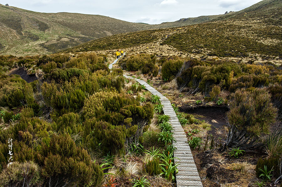 徒步的线路单程有3.5公里的山路,往返要走7公里,不过路都是用木板铺设好的,徒步变得容易多了。天气阴沉,风很大,能看到停在海湾里的船和岛上最高的山峰。沿路边多是黄色的低矮茂盛的茅草,还有很多低矮的植物和灌木,有的开着鲜艳的花,这些植物大多数都是没有见过的,叫不上名字。还看到有几只黑灰色的贼鸥在远处。