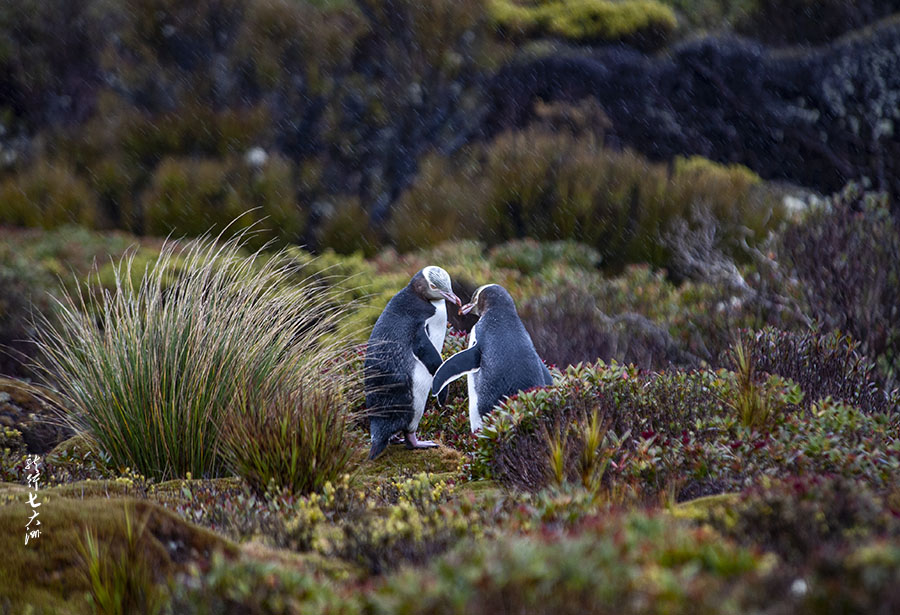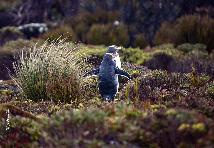 我们走的短线是有木板铺设的木栈道,徒步相应容易多了。没走多远,就发现在离路几十米的地方有两只黄眼企鹅,因为下着雨,能见度比较低,用600mm的长焦拍了下了,能看到并拍到黄眼企鹅,让我兴奋不已,因为黄眼企鹅是这里独有的物种,是世界上最稀有的企鹅之一,也是现有企鹅中最古老的物种,现存仅有不足4000只,已被列入了濒危物种名录。