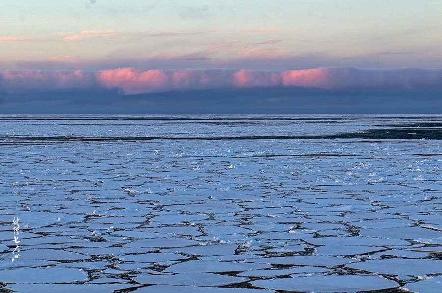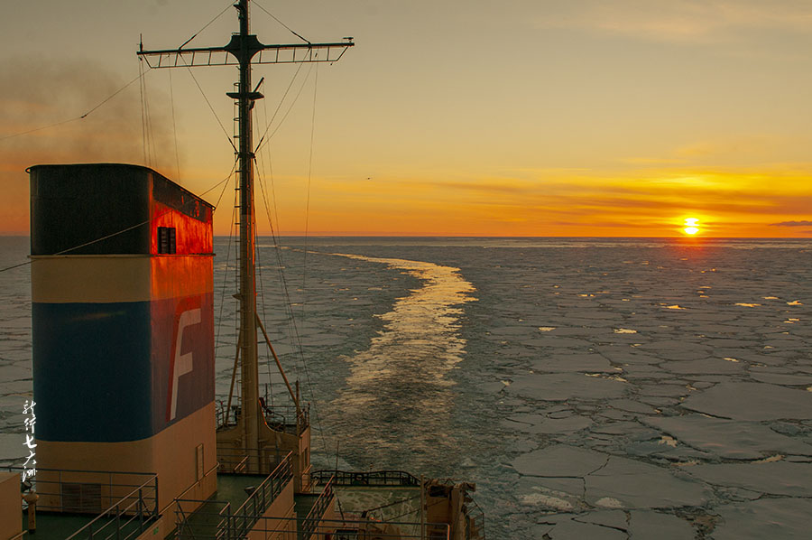 海面都是浮冰, 看过了太多的浮冰,船上的乘客已经没有人感兴趣了。直到夜里落日前, 才有一些人人到船顶来拍照。