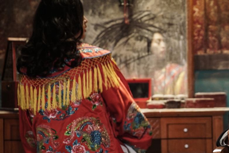 木质梳妆台前摆放着胭脂水粉,一套血红色旦角戏服悬在衣架上,墙上的日历每一页都是同一天。