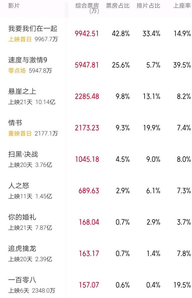 而排在单日票房排行榜第二名的是好莱坞特效大片《速度与激情9》的零点场。