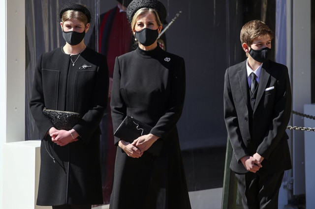 爱德华王子的妻子苏菲和女儿路易丝和儿子詹姆斯。索菲公主选择宽阔的发箍,而不是帽子,而露易丝选择厚实的头饰。苏菲和女儿路易丝都穿着不同的黑色连衣裙,端庄而优雅。