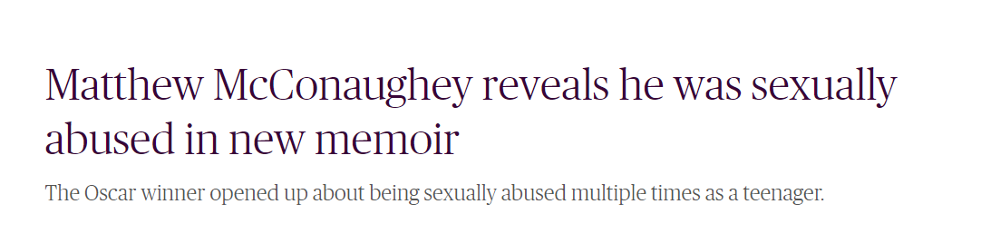 除了原生家庭的问题之外,马修麦康纳还在自传里揭露了自己曾遭受过的性侵害。