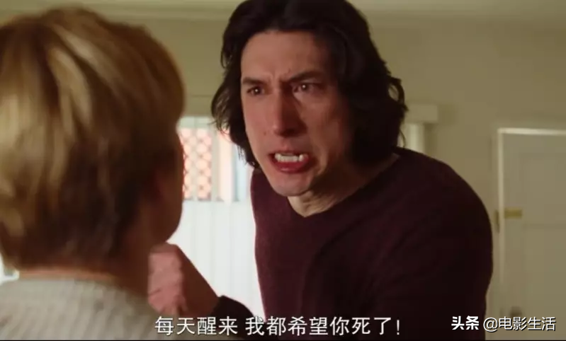 这是影片中戏剧冲突最强烈的一场戏,也是影片中最催泪的一场戏。密集的台词非常考验演员表演功底,稍不留神就有可能演得尴尬不已。但好在寡姐和亚当都是实力派演员,将歇斯底里的状态和对婚姻彻底失望的情感完美结合在一起。