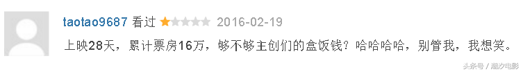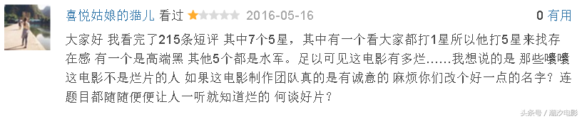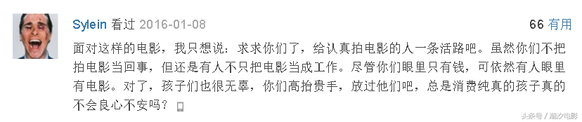 说着说着给说偏了,最后希望大家珍爱生命,拒绝烂片,也希望潮汐以后,能够少看些让我看评论就笑出声的电影,毕竟电影是第八大艺术,是精神食粮,我们需要精神食粮,喜欢也乐于接受国产的精神食粮,但是前提是:影院放映的是希望,不是砒霜。