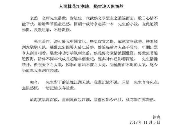 金庸于2018年10月去世,11月5日徐克写文缅怀,想必徐克对金庸也是感情复杂。如今徐克再拍《神雕侠侣》,估计也难再出风韵了。(撰文:mankei wu)