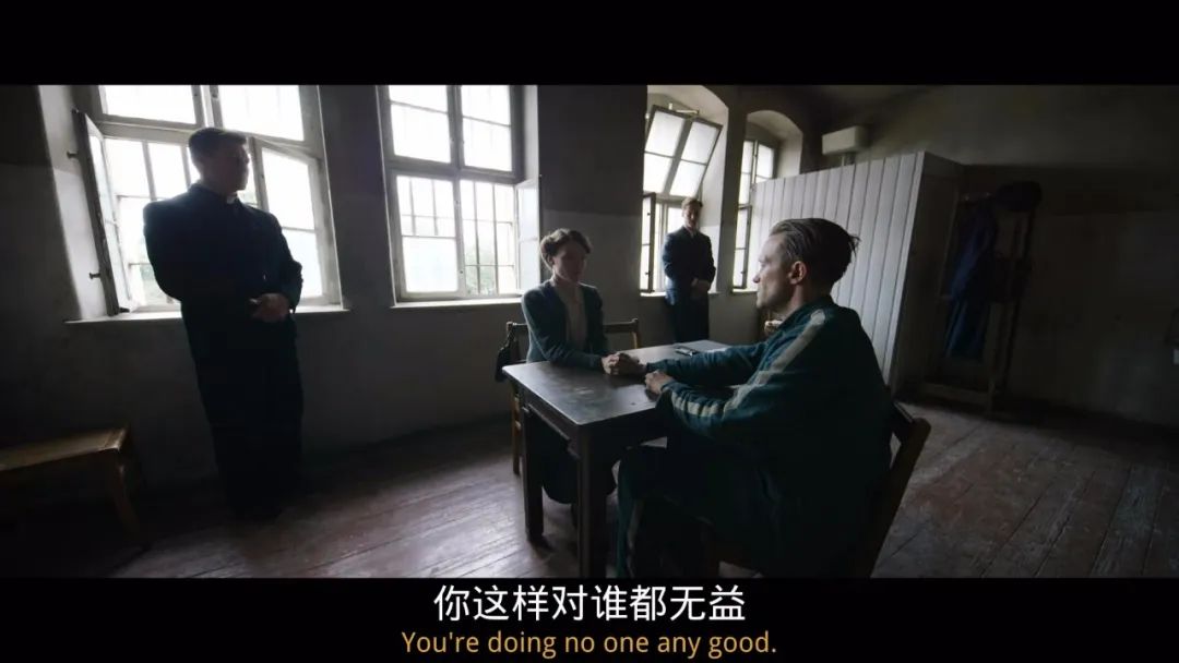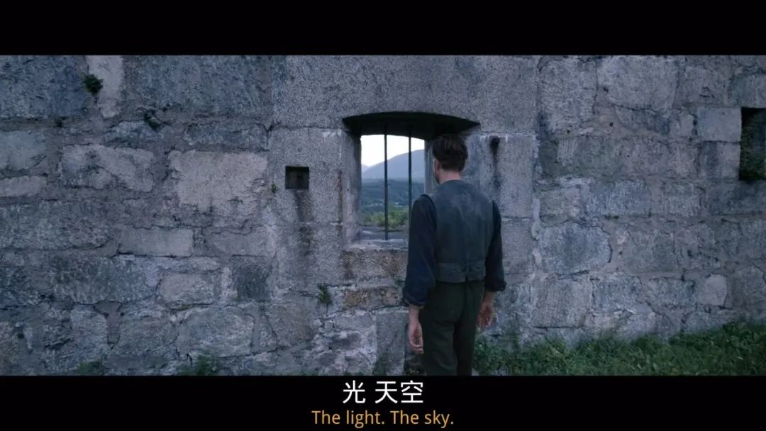 由此可见,马力克的叙事抽离,其实是为了论证和强调角色的“此在”,在时间的长河中,找到这群被忽视了的人的存在意义。片中,律师一次次劝服深陷牢狱的男主角弗兰茨签字,“签了字,你就自由了”,弗兰茨回复,“我现在就是自由的”。