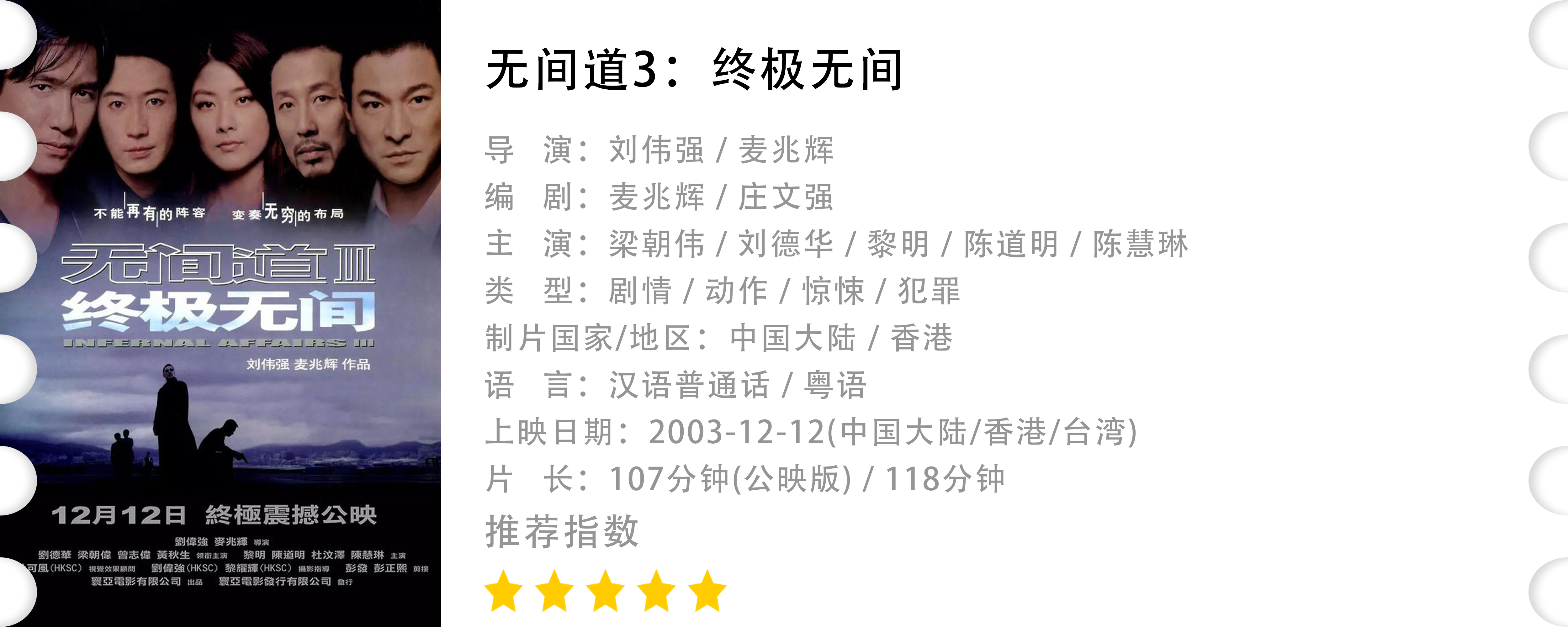 刘德华本人也于2004年凭借《无间道3:终极无间》获得了第41届台北金马奖最佳男主角。该片讲述了刘建明(刘德华 饰)杀了陈永仁(梁朝伟)后,接近陈永仁的心理医生李医生,想知道陈永仁的过去,从中找到杨警官是卧底的证据。在了解陈永仁过去的过程中,刘建明却不知不觉地人格分裂出陈永仁的角色。