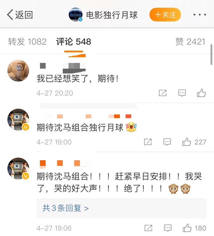 杀青图组在网络上刚刚公布就引发了广大网友的讨论,有网友评论:已经想笑了!超级期待二人的合体!这一次,沈马组合又会带给我们带来怎样的惊喜呢?让我们一起期待!