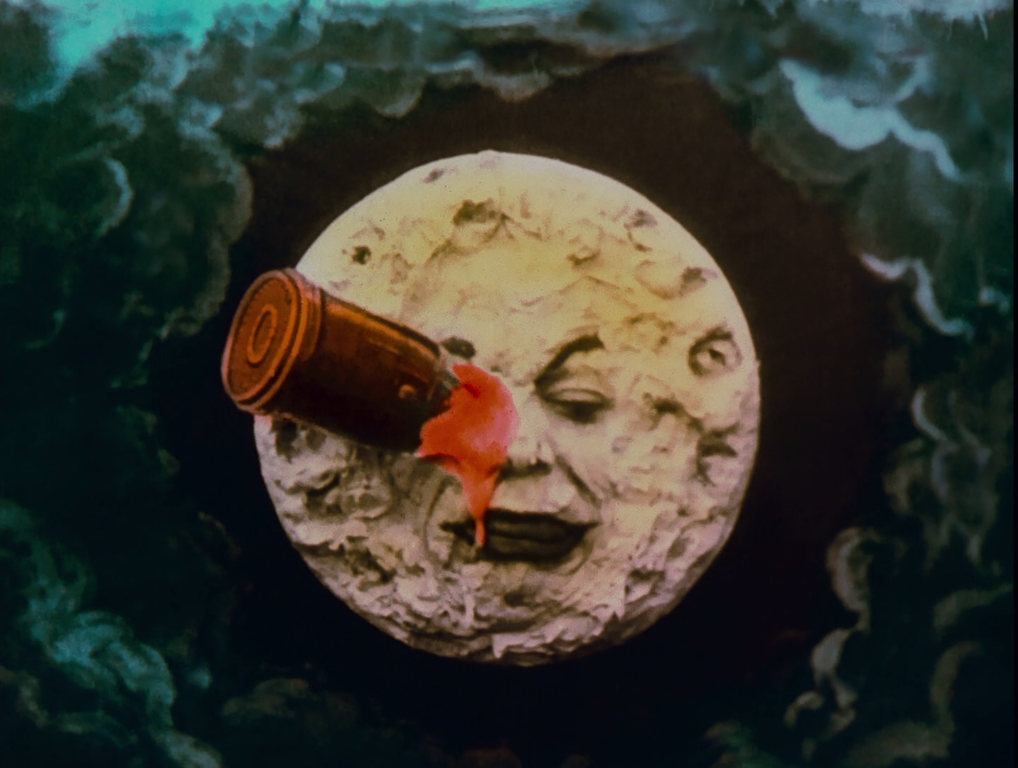 1902年,在法国导演乔治·梅里爱的《月球旅行记》中,用硬纸板做的火箭一头栽入月球上,从月球中往外看的那张脸上好像涂满了刮胡霜。这部短片可以说是可追溯的科幻片里最“古老”的一部,技法粗糙、笨拙,但效果奇幻迷人。