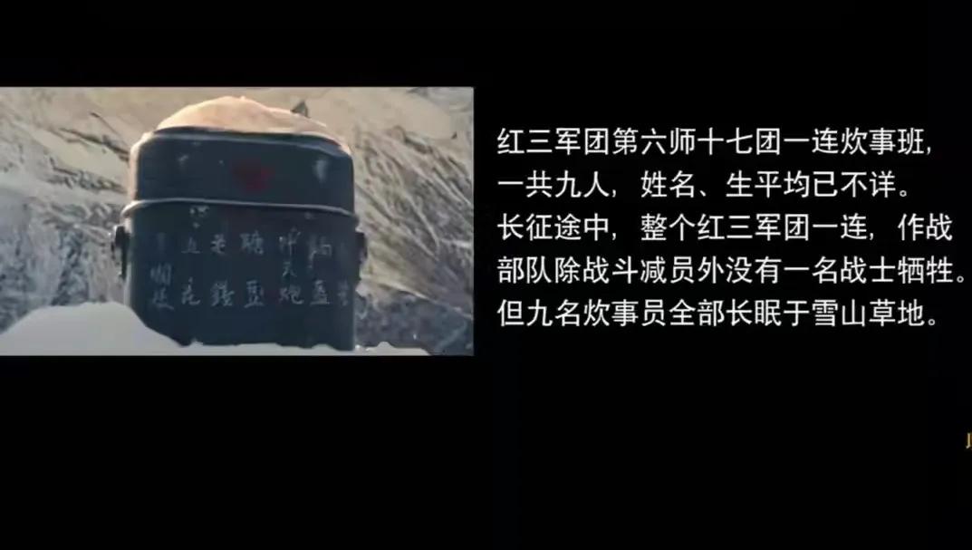 这是一个真实的故事,“红三军团第六师十七团一连炊事班,一共9个人,他们的姓名、生平均不祥,在长征的途中,整个红三军团一连作战部队除了战斗减员外,没有一名战士牺牲,但是那9名炊事员全部长眠于了雪山与草地。”