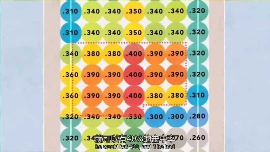 巴菲特特别喜欢特德·威廉姆斯写的《击打的科学》这本书。书里特德总结出了一套如何打出好球的方法:整个棒球场大概有77英寸的好球区,而在其中的最佳击球位置,他就有40%的几率打出好球;而在其他位置这一几率会降至20%左右。