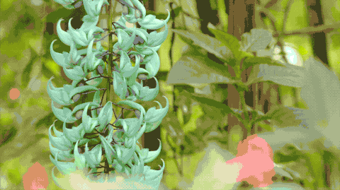 翡翠葛,一种像蓝色的禾雀花,就像松绿石,非常的漂亮,在很多地方是很稀有的,在秘密花园里,它几乎一年都在开花,非常繁密。