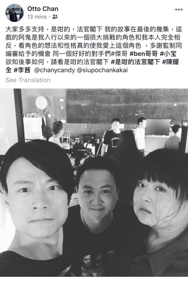 陈志健在自己的社交网也有发文表示,指这次在剧中的角色确实难忘:「阿鬼是我入行以来的一个很大挑战的角色,和我本人完全相反,看角色的想法和性格,真的使我爱上这个角色。」
