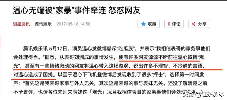 2017年表哥刘洲成因家暴事件闹上热搜,“好表妹”温心迅速发了个通稿《温心无端被“家暴”事件牵连,怒怼网友》。