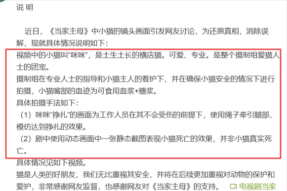 《当家主母》中有一段猫中毒后,挣扎着从桌子上掉下来,吐血身亡的镜头。看剧的观众有不少是爱猫人士,有一定的饲养经验。他们越看越不对,这样的镜头过于真实,猫猫肯定受到了伤害,他们就向剧组提出了质疑。