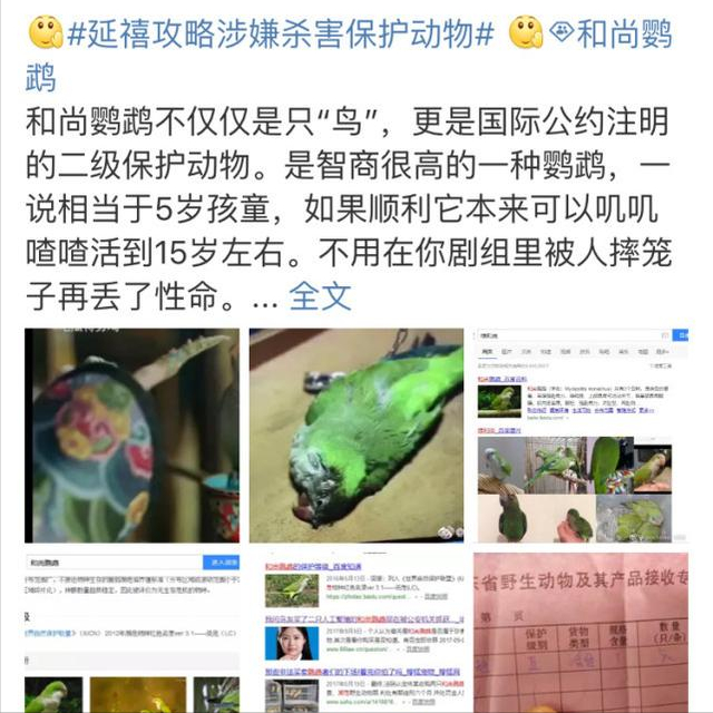不仅这次,之前爆火的《延禧攻略》也曾因为拍鹦鹉死亡的照片,疑似把珍贵的国家二级保护动物给弄死了,但后来随着剧播完也就不了了之了。